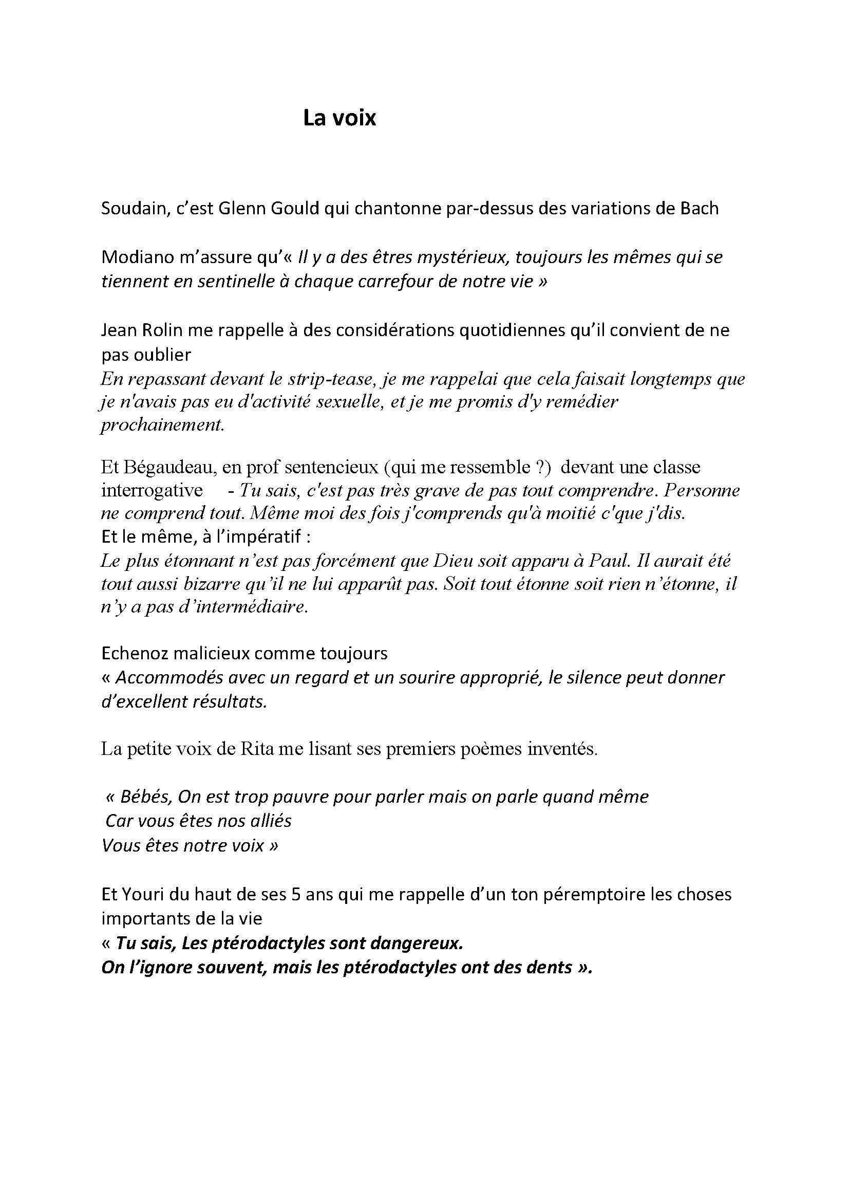 « ...dans ce monde où tout file à toute allure vers le passé, la voix serait la seule chose issue de nous capable de demeurer miraculeusement dans le lieu singulier où elle se trouve. »